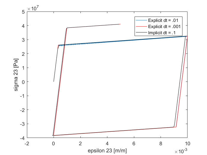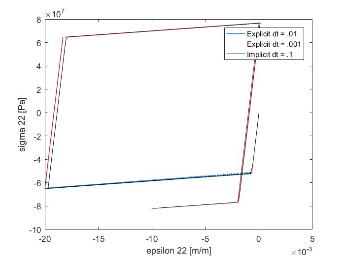 at each time step in order to update the stress-strain response in the 1-1, 2-2, and 2-3 directions. The implicit method solves the two equations at the current and next time step simultaneously. The implicit method does this by utilizing an initial guess to be updated every iteration, and a multivariate Newton-Raphson method to refine the initial guess based on a given error tolerance. The concern when using either method is getting solutions to converge. The tradeoff between the rigor of each methodology and the size of time step needed to converge becomes quickly apparent.